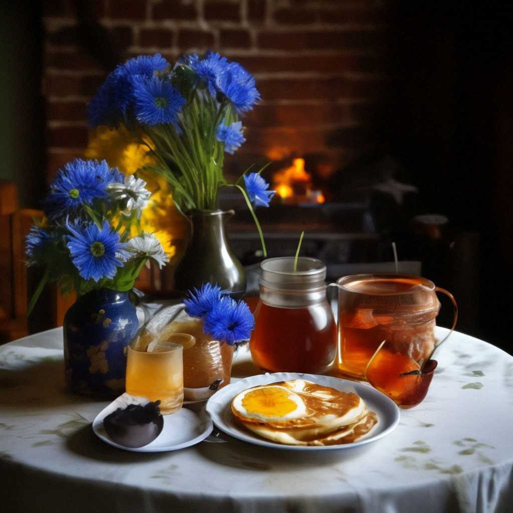 Патэльня ў печы, абрус на стале.